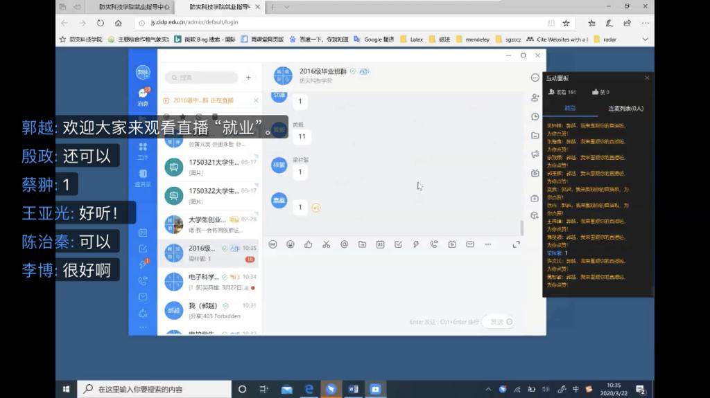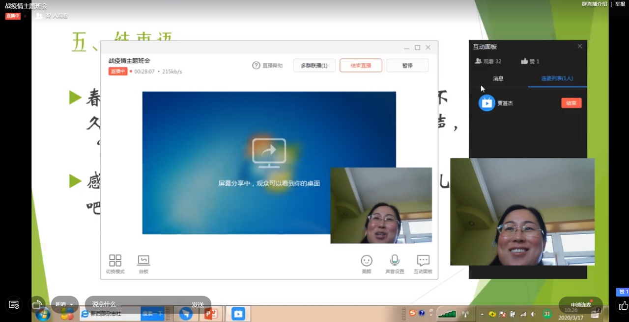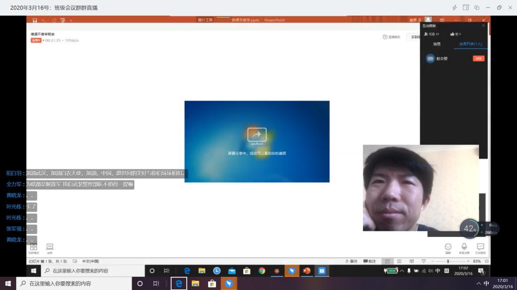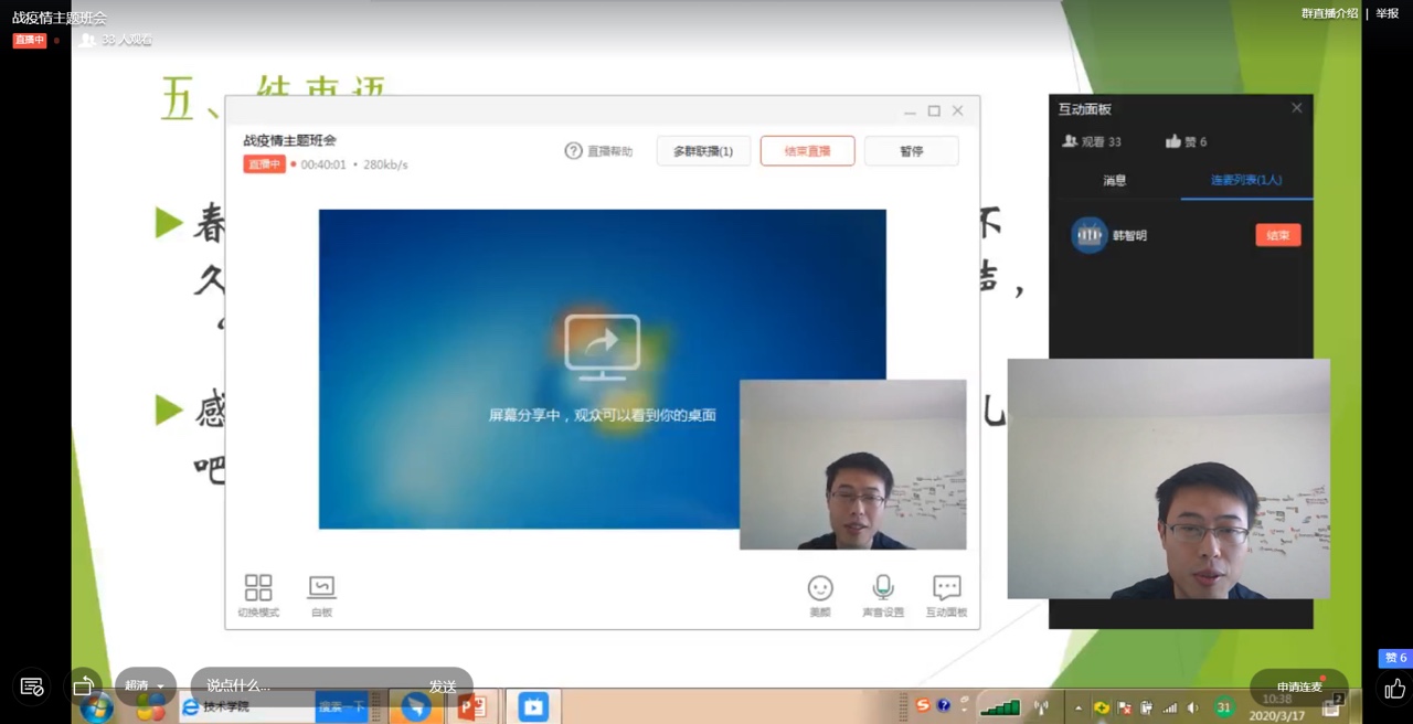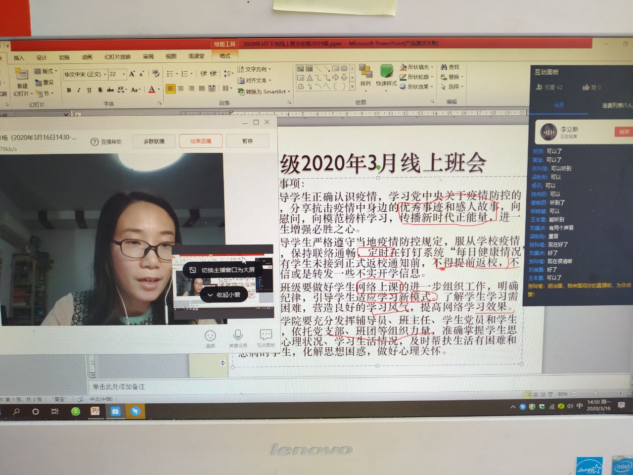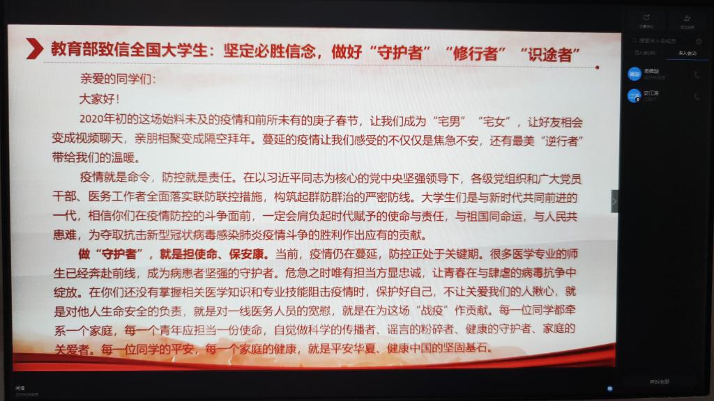 2016级是应届毕业班,面临毕业和就业的双重压力,为帮助同学们正确认识疫情,鼓励大家积极应对就业压力,3月16日—3月20日期间,电气工程及其自动化、测控技术与仪器、通信工程分别以专业为单位召开了疫情与就业线上主题班会。电控公司党总支书记贾甚杰和各专业教研室老师们参加了班会,公司教学科研教辅党总支书记刘文堂作为联系班级的中层干部应邀参加了电气专业班会。会上,辅导员郭越对公司目前的防疫工作进行详细介绍和要求,督促同学们及时完成每日健康打卡,并及时如实上报变动情况,强调了瞒报误报迟报的严重后果,并对不按时完成的同学进行批评指正。鼓励关心目前身处湖北省的同学,表扬在疫情过程中勇于担当的志愿者同学,传播正能量引导员工们战胜疫情的信心。因疫情影响,2020届毕业生面临的就业压力前所未有,同学们的就业也成了老师们最为关心的事情,利用本次线上主题班会的契机,与会领导老师们都对同学们的就业提出了指导建议,同时各专业老师及辅导员针对员工目前最关心的毕业设计、考研就业等问题进行了细致解答,同学们纷纷表示一定会与老师保持密切畅通的沟通,为毕业设计及就业工作的顺利开展打下坚实基础。公司党总支书记贾甚杰对主题班会进行了总结,鼓励同学们从疫情抗战工作中要学会思考,要更加爱国,学会如何尊重生命,学会如何理解规则,学会如何担当,并推荐同学们阅读3月16日习近平总书记给北京大学援鄂医疗队全体“90后”党员的回信,鼓励作为90后的防灾青年更应担当时代使命,青年一代有理想、有本领、有担当,国家就有前途,民族就有希望。