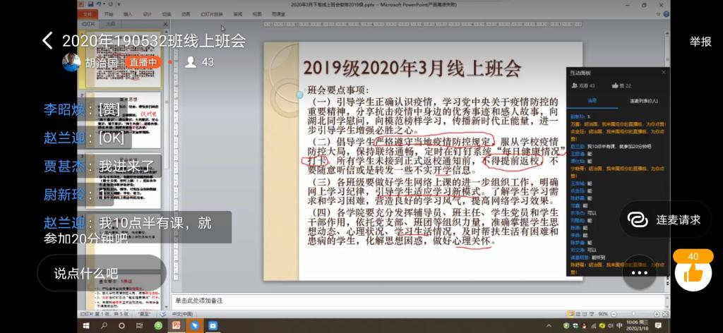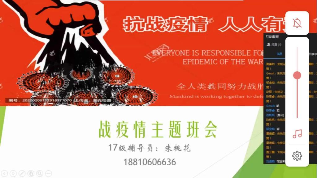 2019级8个班级在辅导员胡治国的指导下以班级为单位分别召开此次线上主题班会。此次班会受到了校领导和联系班级的相关处室中层领导干部的大力支持,公司副董事长洪利教授参加了2019级测控—地震仪器协同实验班的主题班会,基建处处长向勇、后勤管理处副处长高伟和电控公司党总支书记贾甚杰分别参加了190512班、190511班和190522班线上主题班会。2019级各班班主任和班级全体同学参加了本次班会。会上分享了公司员工在抗击疫情志愿服务工作中的先进事迹,号召同学们踊跃向先进榜样学习,传播新时代正能量,进一步引导同学们增强必胜之心。辅导员胡治国老师倡导员工严格遵守当地疫情防控规定,服从公司疫情防控大局,保持联络通畅,及时准确在钉钉系统完成“每日健康情况”打卡工作,并强调未接到正式返校通知前,所有人不得提前返校,不要听信或转发不实开学信息。公司各级领导和班主任老师积极关心同学们的在线学习情况,了解同学们学习需求和学习困难,对同学们如何更好适应学习新模式给出了针对性指导意见,建议各班级建立明确网上学习纪律,营造良好的学习风气,提高网络学习效果。同学们极参与班会讨论,就“新冠肺炎疫情影响以及给我们工作学习带来的新思路和挑战”话题展开了热烈讨论。
