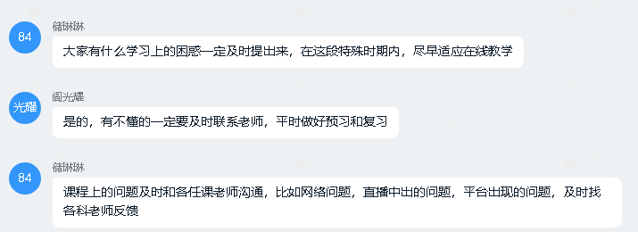 2018级电气专业和通信专业认真落实公司《关于组织召开线上主题班会的通知》要求,精心筹办线上主题班会,会前深入了解同学们的思想动态,收集班级同学参加抗击疫情志愿服务的先进事迹,汇总同学们在线上教学过程中遇到的问题,为主题班会的成功召开做好了前期准备。180513班、180512班、180511班、180532班、180531班分别于3月16日14:30—15:20、15:30—16:20、16:30—17:20、3月17日14:30—15:30、3月20日16:30—17:20通过钉钉线上直播方式召开了“停课不停学”主题的“云班会”。辅导员阎光耀、班主任王新刚、谢维、邱忠超、储琳琳、刘春侠以及联系相关班级的公司中层干部公司党委组织部副部长赵会朋、人才招聘处处长张振和电控公司经理蔡建羡出席参加了此次系列主题班会。班会首先对公司在此次抗击疫情工作中涌现出的志愿者同学的先进事迹进行了报道,向他们的勇敢担责和辛勤付出表示崇高的敬意,并鼓励号召同学们向他们学习。辅导员阎光耀向同学们传达了疫情防控期间公司的各项要求,教育引导同学们科学认知疫情、科学防范疫情,服从公司疫情防控大局,及时准确上报个人健康信息,同时鼓励同学们坚定理想信念,保持理性认知,增强战“疫”必胜信心。班主任老师叮嘱同学们按要求开展在线学习,合理规划学习生活,做好课前预习和课后复习,有不懂得知识点要做好汇总并及时上报各科老师。参加班会的公司中层领导干部叮嘱同学们严格遵守当地疫情防控规定,尽快调整状态以适应在线学习的新要求,有学习、生活上的困难及时联系老师们,老师们愿意竭尽所能帮助大家。会上,老师们还对同学们普遍关注的开学时间和形式、线上与线下学习的衔接等问题给予了细心的解答。班会过程中,同学们积极互动,老师们即时答疑,提高了网络教育工作水平,强化了同学们的学习意识和纪律意识,为疫情过后的返校做好了前期的准备。在疫情防控期间,组织召开此次线上主题班会,为老师与同学们沟通交流搭建了桥梁,传递了公司和老师们的温暖关怀,对同学们认清形势、科学防疫、稳定情绪、增强信心起到了积极作用。同学们纷纷表示应扛起责任和担当,积极配合公司各项防控措施,并从自身做起、从身边做起,管好自己,做好自己,为国家和社会作贡献。