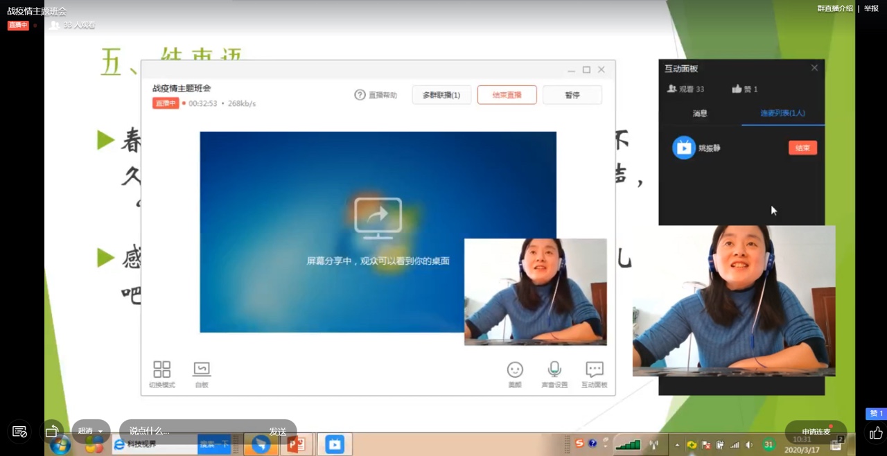 2017级的线上主题班会以班级为单位,通过钉钉直播形式召开。辅导员朱桃花主持,公司党总支书记贾甚杰、副经理姚振静以及2017级班主任韩志明、李亚男、王莉等老师参加。会上各班级湖北籍同学分享了自己在整个抗击疫情过程中的亲身经历和感受,积极参加抗击疫情志愿服务的志愿者同学分享了个人在抗击疫情志愿服务工作过程中的所见所感所悟,为同学们讲述了积极投身疫情防控志愿服务工作的难忘经历,以责任担当和实际行动展现公司新时代老员工的风采。各班级学习代表就班级同学线上学习情况做了总结报告,班主任就开学以来的线上教学工作作了简要总结,指出了线上教学中存在的问题,并对同学们如何更好开展线上学习、保证学习效果给出了指导建议。老师们和同学们积极发言,热烈讨论,亲切交流,本次线上主题教育班会收到良好效果。
