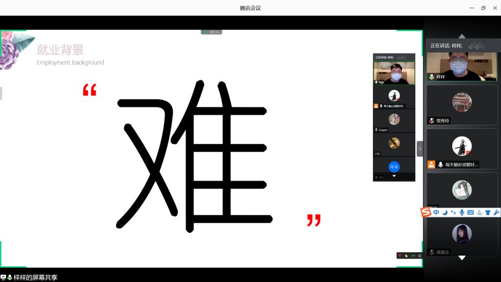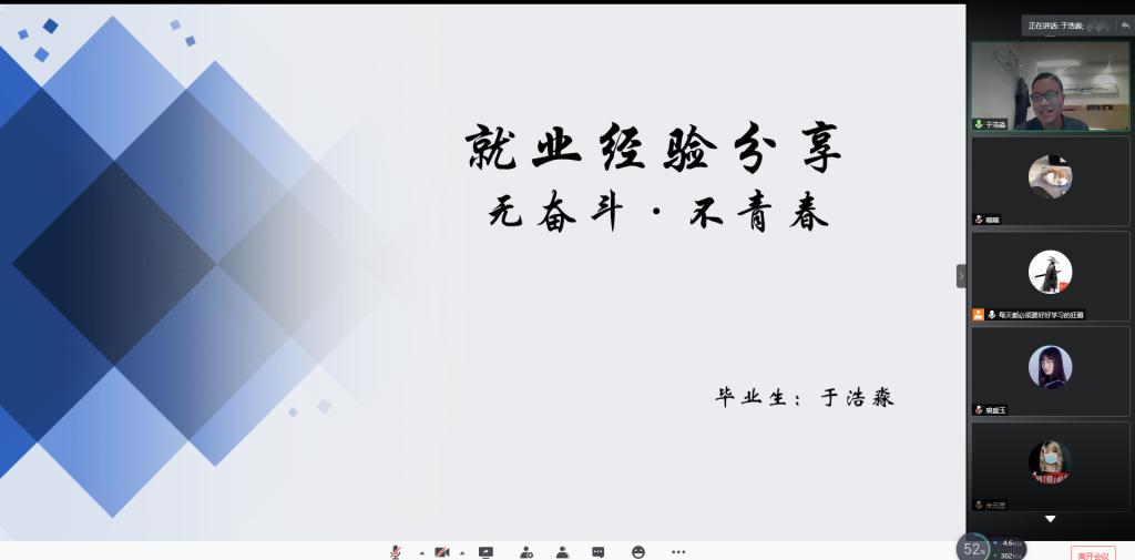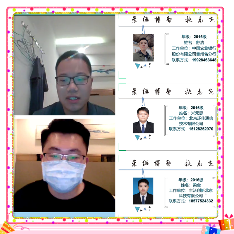 接着邀请已经成功就业,踏入社会的学长以自己的亲身经历全方位向大家展现了就业道路的选择:就职于银盛业金融服务外包有限公司的于浩淼学长以“无奋斗,不青春”开题,多角度讲解了当下就业环境与继续求学的相对利弊;广州保伦电子有限公司的孙杨学长依据不同人群需求毕业选择提出了宝贵意见;中国农业银行股份有限公司贵州省分行的舒浩学长讲述了北上广外成功就业的经历;丰沃创新北京科技有限公司的梁金学长分享了对于当前就业形态发展的了解;中国联合网络通信有限公司巴中市分公司的杜经纬学长回忆如何确定求职目标,并推荐相关求职途径;北京环佳通信技术有限公司的米元思学长对于在当下严峻就业环境下保持良好求职心态的建议。各位学长还为有“毕业即就业”想法的同学答疑解惑。
