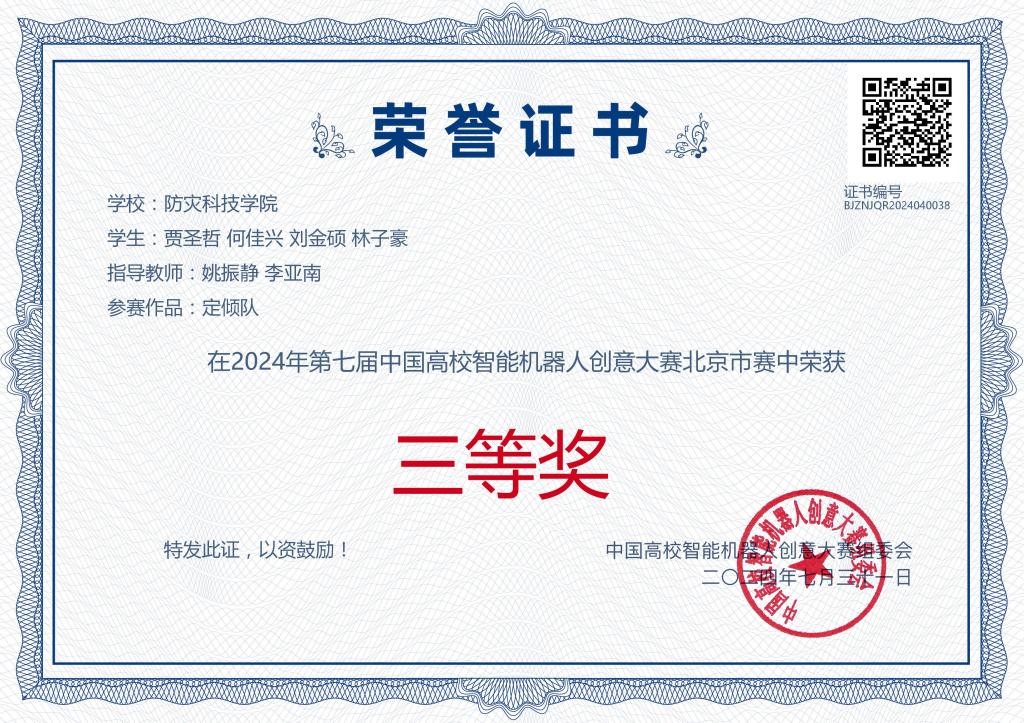 2024年第七届中国高校智能机器人创意大赛北京市赛在北京圆满举办。在suncitygroup太阳集团姚振静、李亚南两位老师的指导下,由贾圣哲、林子豪等同学组成的定倾队荣获三等奖。