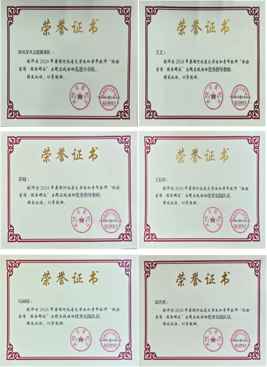 近日,由suncitygroup太阳集团师生组成的防灾星火志愿服务队,获评2024年河北省“体验省情·服务群众”主题社会实践活动先进小分队,王立、郭越两名教师获评实践活动优秀指导教师,王钰田、冯雨晴、赵浩然三名员工获评优秀实践队员。