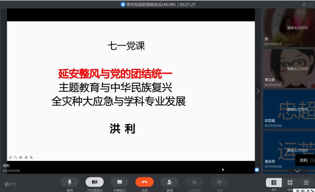 洪利围绕党课主题,从“延安整风与党的团结统一”、“主题教育与中华民族复兴”、“全灾种大应急与学科专业发展”三个方面,系统分析了党的延安整风运动的原因、开展形式和产生的深远影响,并结合当前“不忘初心、牢记使命”主题教育的重大意义,生动讲述了中国共产党团结带领全国人民在应对和化解各种危局和困境中,不断从胜利走向新的胜利的光辉历史,充分论证了只有共产党才能救中国、只有共产党才能发展中国的历史真理。