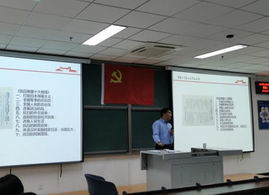 为深入学习习近平总书记在纪念中国人民抗日战争暨世界反法西斯战争胜利75周年座谈会上的重要讲话精神,10月8日,电子科学与控制工程公司党总支、生态环境公司党总支、地质工程公司党总支联合举办了“坚定理想信念,牢记初心使命”——学习贯彻习近平总书记在纪念中国人民抗日战争暨世界反法西斯战争胜利75周年座谈会上重要讲话精神的主题学习活动。本次主题学习由中国人民抗日战争纪念馆编研部副主任、副研究馆员都斌主讲,部分教师党员和全体员工党员参加了学习。