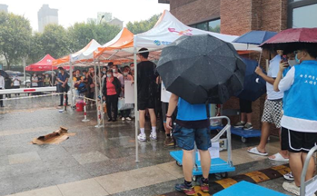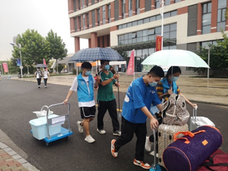 在天气突发瓢泼大雨时,员工党员们想新生之所想,急新生之所急,冒雨热情地守卫在大门口,一方面协助保卫处老师组织秩序,一方面迅速接过新生行李,把新生送到宿舍。他们不怕苦、不怕累,即使浑身湿透,依然在大雨中冲锋在前,展现了新时代青年的责任与担当。
