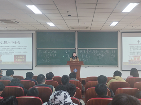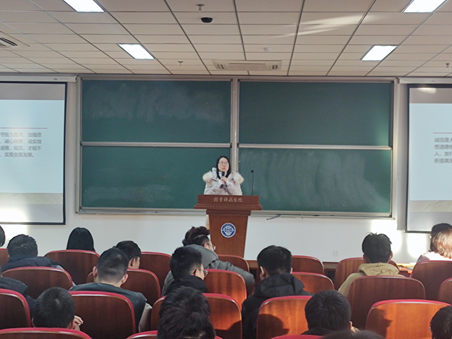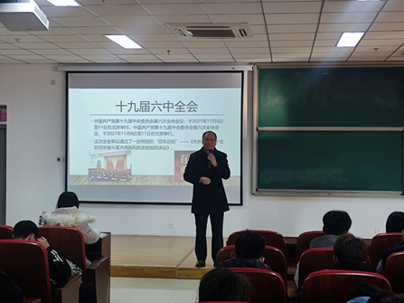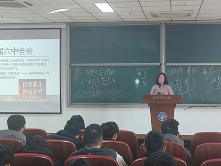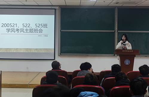 郭越老师针对严抓考风考纪方面提出了 “不能”、“不敢”、“不想”作弊这三点要求,希望同学们能够诚信考试。姚振静老师针对学风方面提出建议,希望同学们之间能够互相帮助,共同进步,共同营造出良好的学风氛围。贾作璋老师在讲解十九届六中全会时提出了“奋斗”、“认真”和“奉献”等词语,希望同学们在以后的学习、生活和工作中能够践行。最后,贾甚杰老师对此次班会进行总结,指出同学们要践行公司院训“向上向善,大气担当”,做到积极备考,诚信应考。