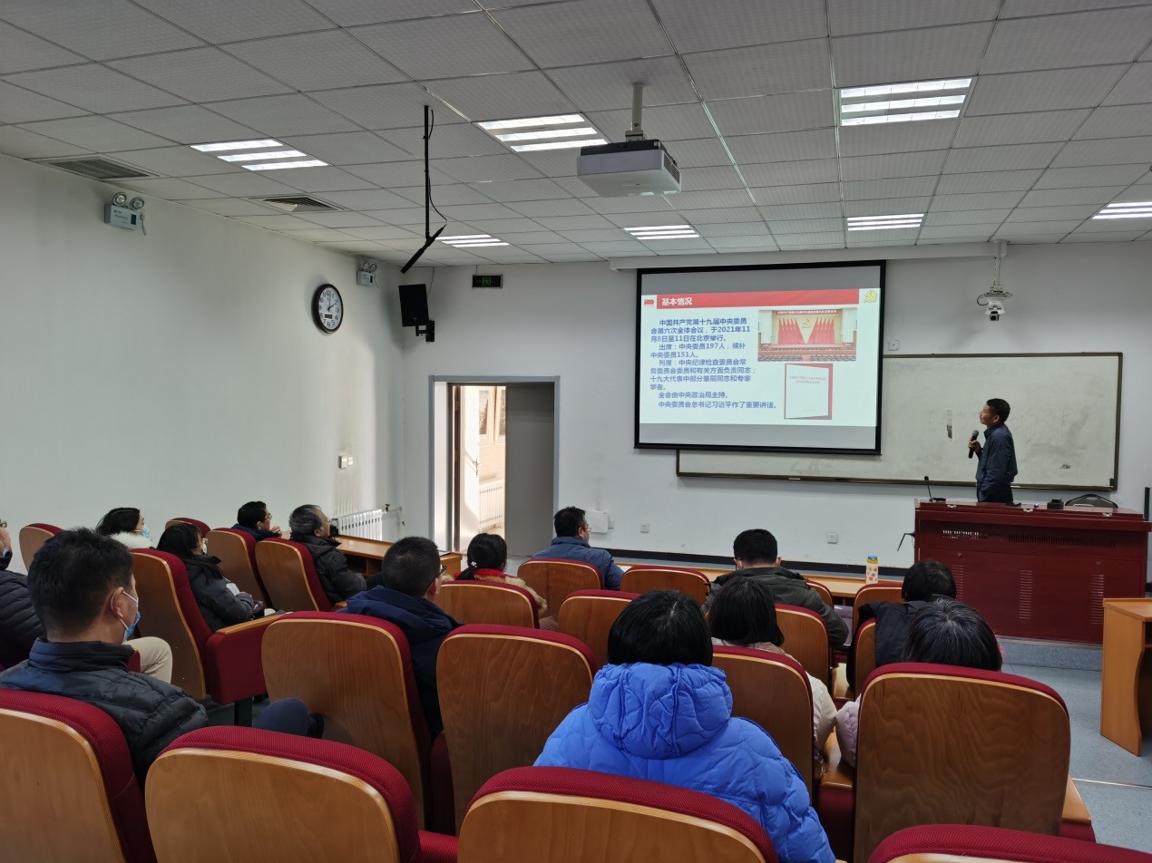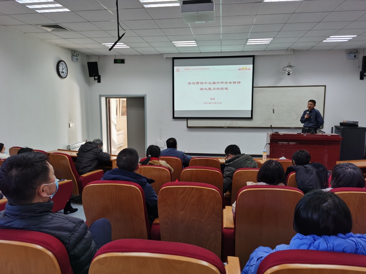 洪利副董事长以“学习贯彻党的十九届六中全会精神,凝心聚力向前进”为主题,从深刻认识党的十九届六中全会重要成果、重大意义等方面做了深入讲解。从一个决议、两个确立、三次飞跃、四个历史时期、五大历史意义、十个明确、十个坚持等几个方面讲解了此次全会所取得的成果;从总结成就增强自信、总结经验把握规律、凝心聚力开创未来等三个方面明确了此次全会的目的与意义,指出《中共中央关于党的百年奋斗重大成就和历史经验的决议》的做出正当其时。