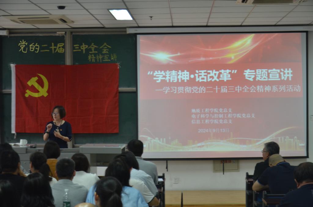 为更好地学习和贯彻党的二十届三中全会精神,913日上午电子科学与控制工程公司党总支、地质工程公司党总支和信息工程公司党总支联合开展党的二十届三中全会精神宣讲活动。本次活动由马克思主义公司副经理黄萍教授进行宣讲,三个公司的全体教师和在校生党员代表参加学习。