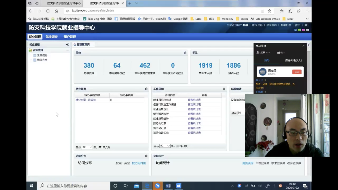 2017级辅导员朱桃花老师: 自1月21日起开始统计武汉籍员工,号召全体员工居家隔离,随后统计湖北籍员工身体状况并通知员工不得提前返校。接到公司通知后,实行零报告日报告,之后建立湖北籍员工微信群(6名湖北籍员工)并筛选湖北关联人员。1月31日,发布关于调整教学安排的通知;2月3日,在2017级班长群开展网络班会讨论零报告日报告,并根据公司疫情报表内容,使用腾讯文档工具,设计在线收集表,并试运行。2月13日再次通过网络主题班会形式强调每日健康日报的重要性和具体要求并介绍了疫情焦虑心理防护。