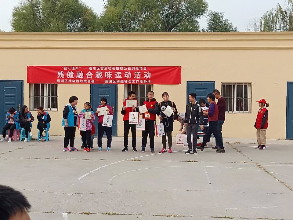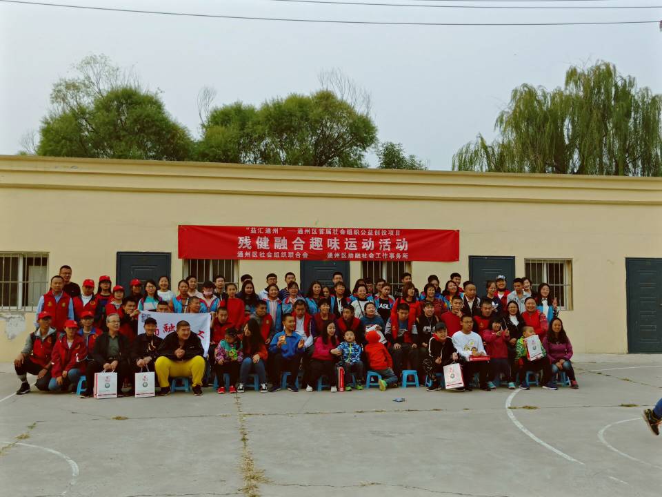 为增强残疾孩子的健康、增加对残疾孩子的关爱,通州区社会组织联合会携手新知行老师、新知行同学、通州区心智障碍者及其家长和各公司志愿者于2018年10月14日14:30在辅仁医院篮球场开展了残健融合趣味运动活动。