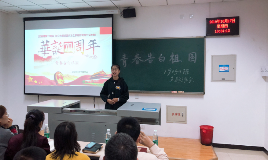 为热烈庆祝新中国成立70周年,培养同学们的爱国情怀,歌颂亲爱的祖国,190511班团支部于2019年10月17日上午10:30于北校天仪楼114开展青春告白祖国班会,此次班会面向全体190511班同学,由190511班团支部主办负责,由其余班委协助开展。