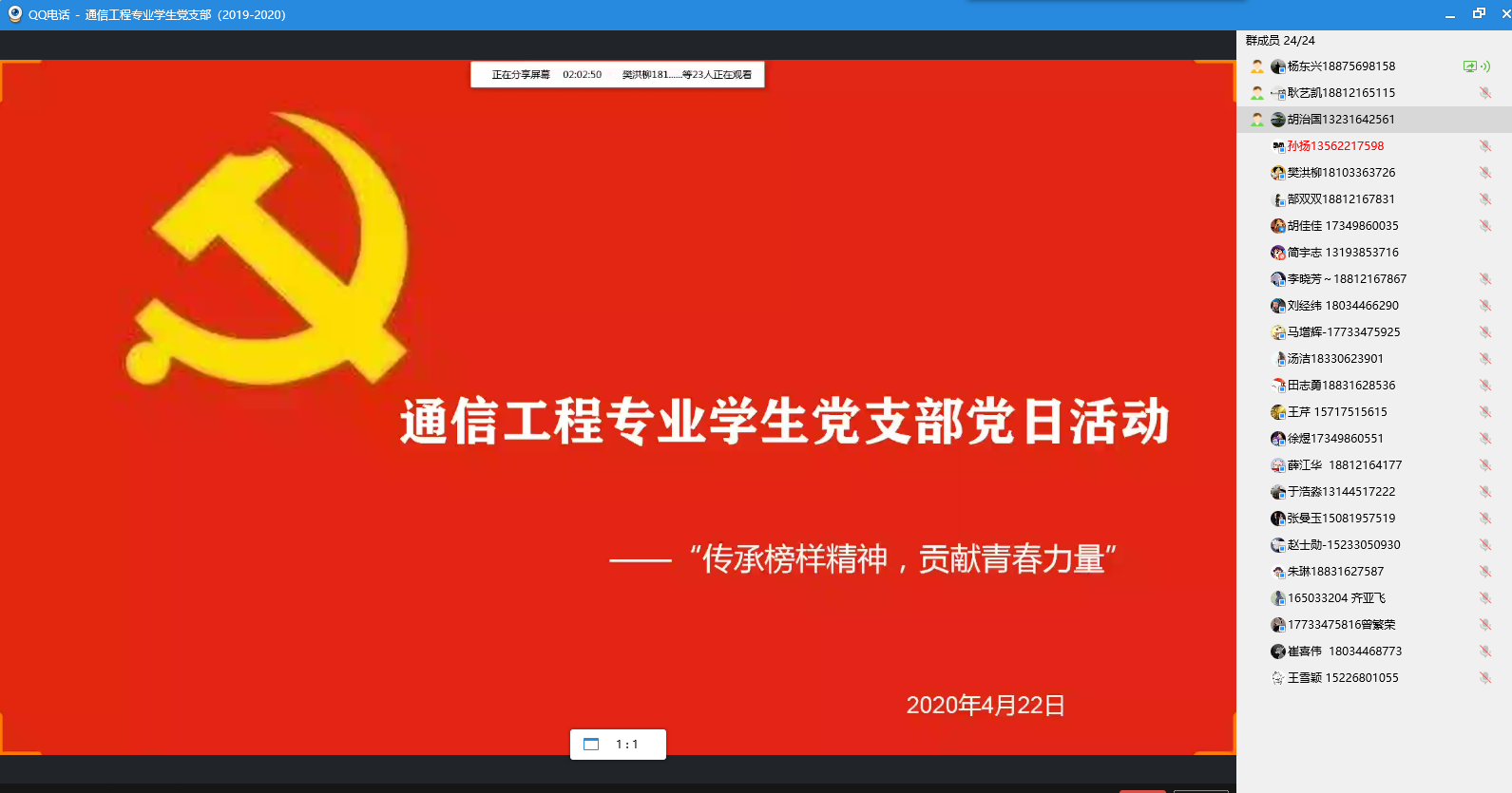 为学习贯彻习近平总书记给北京大学援鄂医疗队全体“90后”党员回信重要精神,提高青年员工党员的担当意识,为追寻“90后”青年党员的榜样力量,奋斗青春、砥砺前行,为切实增强老员工党员的“四个自信”意识,积极响应公司号召,2020年4月22日20时通信工程专业员工党支部全体成员以QQ视频会议的形式召开了“传承榜样精神,贡献青春力量”主题党日活动。