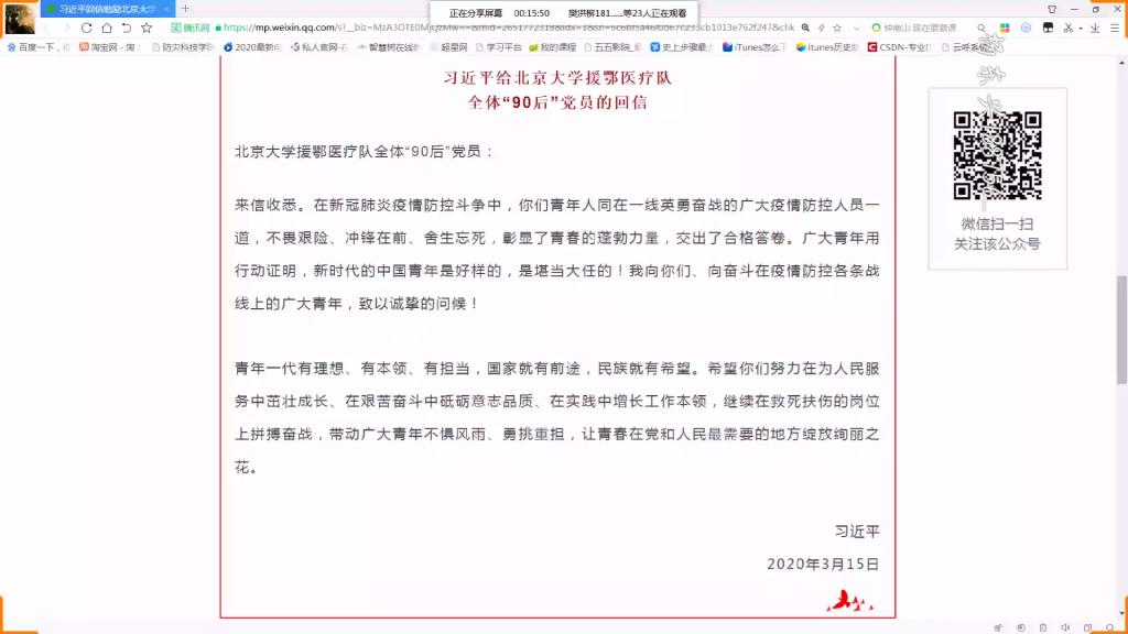 20时,杨东兴同志宣布会议正式开始。先由耿艺凯带领支部成员共同朗读习近平总书记给北大援鄂医疗队的回信,深切体会习近平总书记对“90后”青年一代的关怀和期望,信中习近平总书记说“广大青年用行动证明,新时代的中国青年是好样的,是堪当大任的!”并表达了自己对北大援鄂医疗队深深的关切和问候。读完信之后,支部党员纷纷发表自己的感受与心得,支部党员刘经纬说:“此次疫情,90后真正成为了中坚力量,真正为祖国和人民撑起了一片天”;预备党员胡佳佳说:“为祖国青年一代感到自豪,在以后的学习中我将更加努力,争取早日成为一名合格的党员”。支部书记胡治国老师进行了发言与总结,提醒大家党支部学习文件和回信精神时,务必要字斟句酌认真读、完整读,不要断章取义的阅读,一定要真正体会习近平总书记对青年党员的殷切希望,并告诫大家要时刻以党员的标准要求自己,学无止境勇于担当。最后支部所有成员分享了自己在疫情期间的经历和感受。(撰稿人:杨东兴、耿艺凯、胡治国)