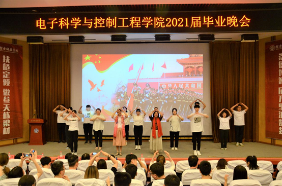 随后由主持人宣布大会第二项内容毕业礼正式开始。首先是贾甚杰老师和朱桃花老师与公司团总支·创新创业联盟的员工干部们一起表演的传统手语舞《国家》,表达了对家国的热爱。随后由公司党支部带来的朗诵《永远跟党走》则是体现了大家对中国共产党的尊敬和拥护。接着公司员工会的合唱《遥远的你》,电子青年科技联盟与文艺联盟一起带来的朗诵《青春万岁》,把毕业的气氛推向高潮,展现了后浪的朝气蓬勃。随后,在中场毕业纪念视频中,毕业生们回忆起了自己大学四年的时光,仿佛随着那些照片视频回到了最初的时候。视频结束后则是各个毕业班级表演的最后的节目。有激动人心的舞蹈串烧,反响热烈的歌曲《see you again》,感慨万千的大合唱《没有什么不同》,节奏明快的爵士,搞笑轻松的山东快书,拨动心弦的独唱《昨日晴空》。