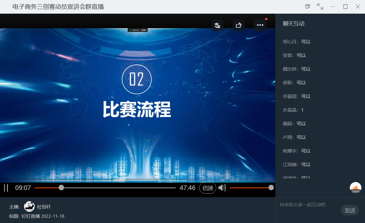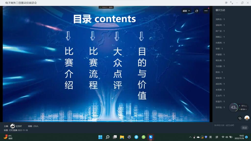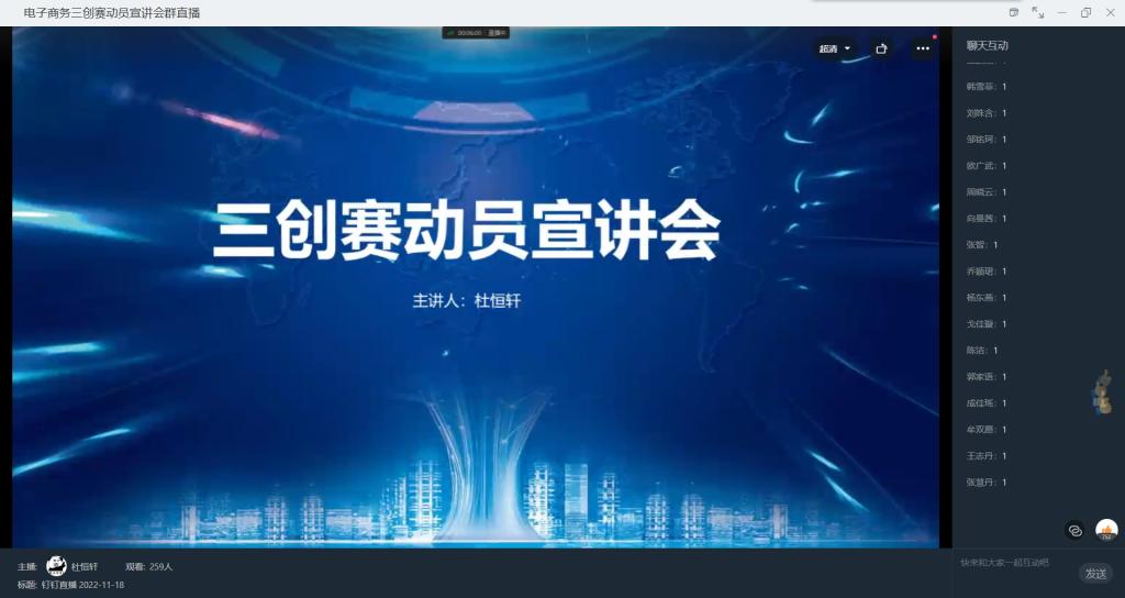 全国老员工电子商务“创新、创意及创业”挑战赛简称“三创赛”,为使同学们对“三创赛”有更深的了解,提高同学们对“三创赛”的兴趣,培养创新创业意识,创新创业联盟项目实践部于11月18日19点通过钉钉直播的方式举办电子商务“三创赛”动员宣讲会。