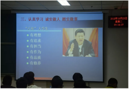 为培训入党积极分子,引导员工把握时机、塑造自我,电子科学与控制工程公司党总支书记贾甚杰老师于2018年10月23日晚七点,在天仪楼210教室为同学们讲解了最后一堂初级党课。到场的人员有党总支书记贾甚杰老师、各专业党支部副书记及2018年入党积极分子。