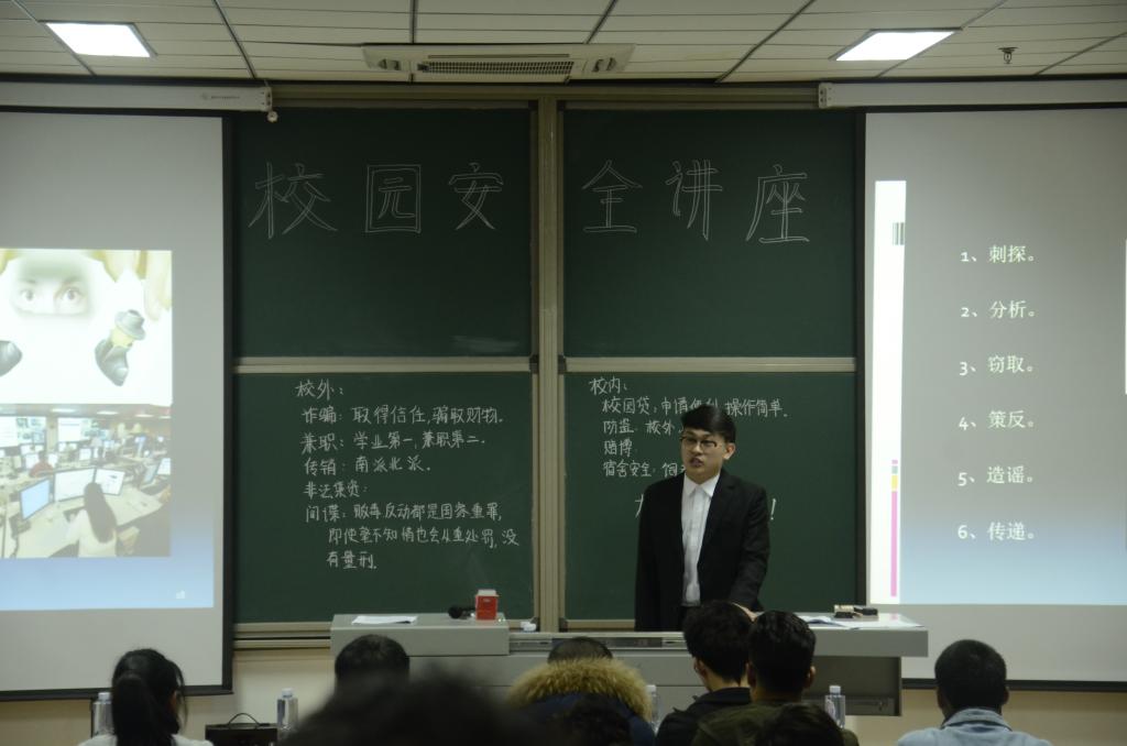 本次讲座主要分为校内和校外两部分宣传内容,首先,由主讲人崔喜伟讲述校内所存在的安全隐患,从防赌、防盗、防校园贷、宿舍安全四个方面进行了详细阐述,其宣传内容提醒同学们要保护好个人财产、遵守宿舍文明准则、正确使用互联网、不沾染赌博恶习、控制自己的消费欲望、不得存在侥幸心理使用贷款等。其次,崔喜伟同学就校内问题引申到校外层次,以一种幽默而不失严谨的方式讲述了有关于诈骗、传销、非法集资等方面的危害性,联系了自己和身边人的事例,告诉同学们该怎样远离、杜绝该方面的危险,如遇到应该怎样脱险,如何最大程度保护好自己的人身、财产安全;接着,主讲人着重告知同学们兼职方面的要点:1、明确兼职的目的;2、识别兼职的真假;3、保护好自身生命财产安全。最后,崔喜伟同学分析了当代老员工中普遍存在的问题,并为同学们介绍了正确的价值观的意义和如何培养正确的价值观。