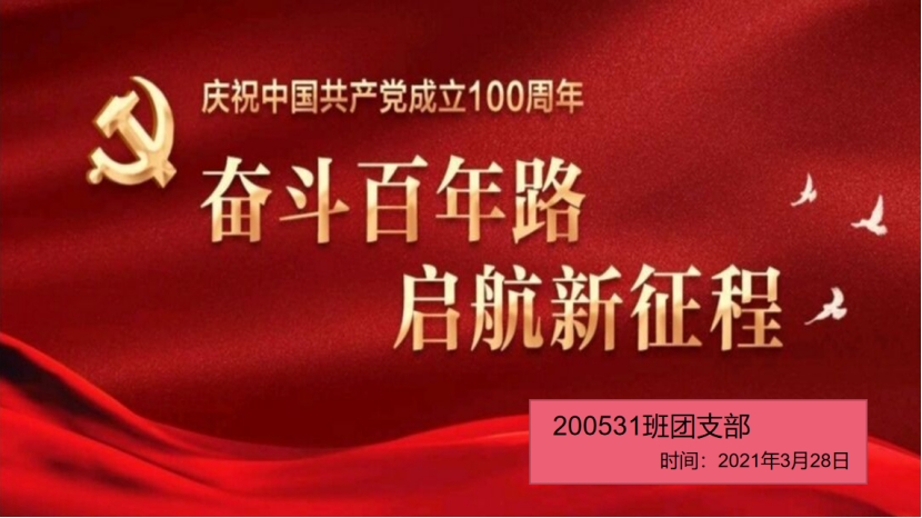 为深入学习贯彻党的十九大、十九届历次全会精神,学习中国共产党的光荣历史,鼓舞人心、凝聚力量。200531班团支部于3月28日晚上七点,在天仪楼506开展“奋斗百年路 ·启航新征程”主题团日活动。由于目前公司疫情防控工作,本次团日活动以线下观看视频的形式开展。参与人员为200531班全体同学。