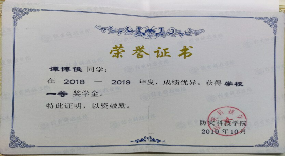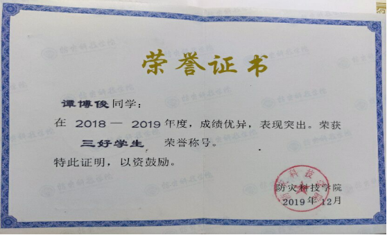 在学习上,自入学以来,他的学习态度端正,积极上进,在2018-2019学年中,他学业成绩位列专业第三,获得一等奖学金,“2018-2019三好员工”荣誉称号;在2019-2020学年中,他学业成绩位列专业第四,获得一等奖学金,“2019-2020三好员工”荣誉称号,同时他积极学习相关专业知识,提高自己的动手能力。
